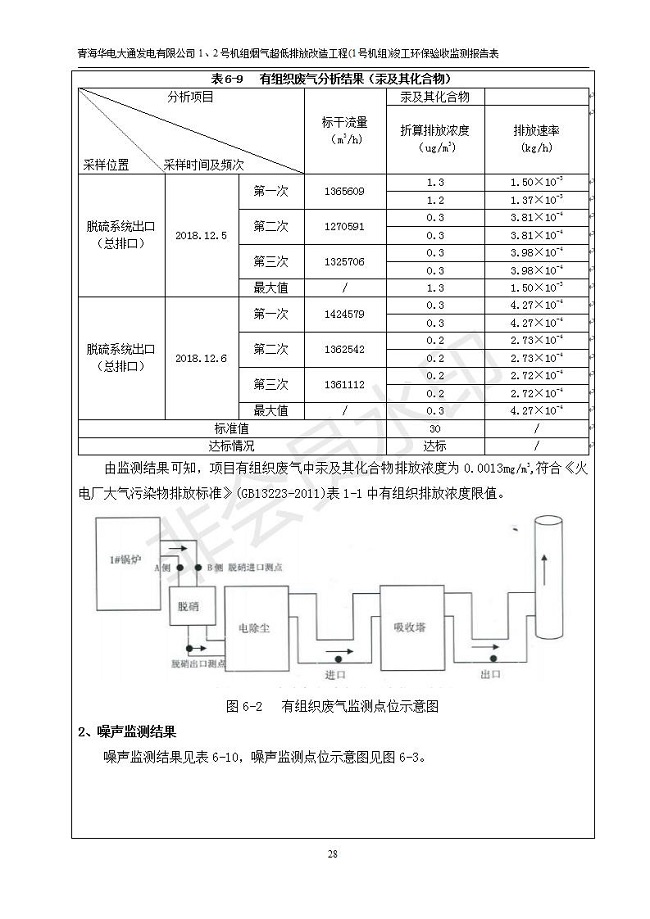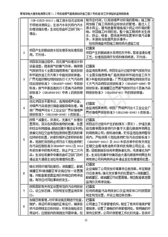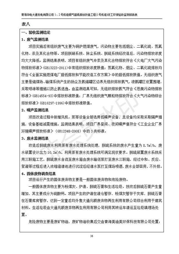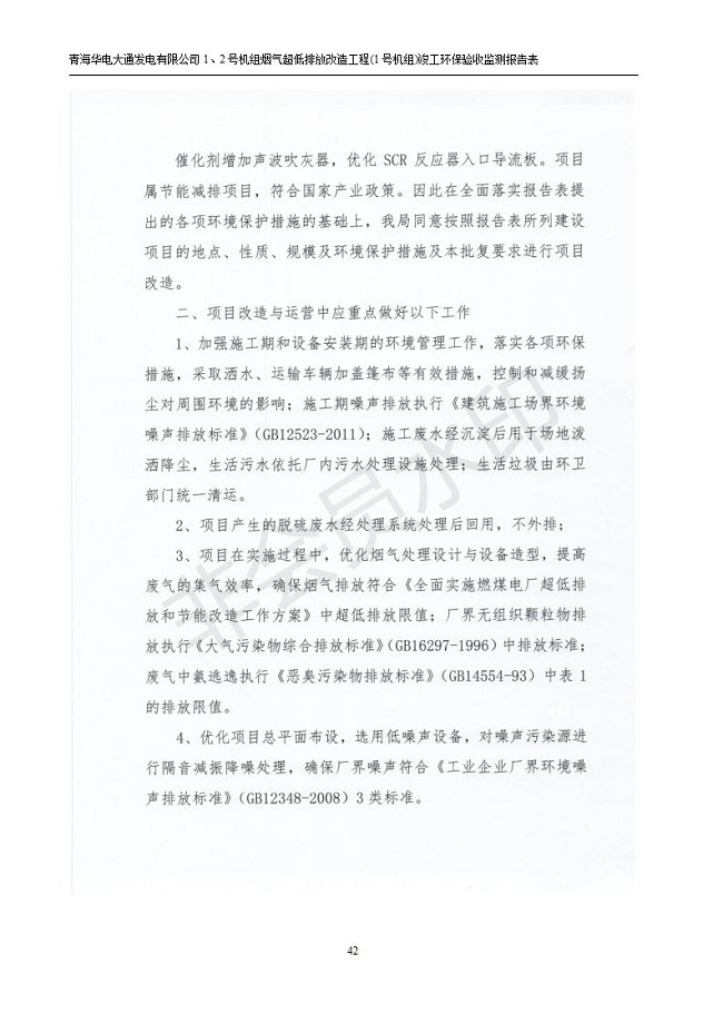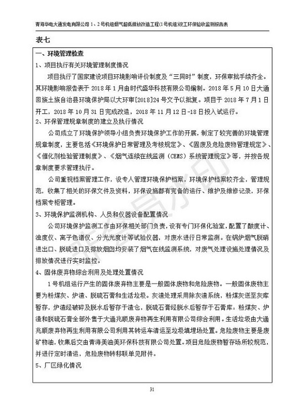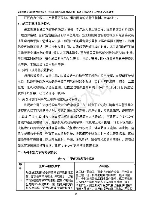 根據(jù)中華人民共和國國務院令第682號《國務院關于修改〈建設項目環(huán)境保護管理條例〉的決定》和《建設項目竣工環(huán)境保護驗收暫行辦法》(國務院令682號),青海華電大通發(fā)電有限公司1、2號機組煙氣超低排放改造工程(1號機組) (包括竣工環(huán)境保護驗收監(jiān)測報告表和驗收意見)公示如下。 一、項目名稱:青海華電大通發(fā)電有限公司1、2號機組煙氣超低排放改造工程(1號機組) 竣工環(huán)境保護驗收監(jiān)測報告表 二、地點:青海省西寧市大通縣寧張公路31公里處 三、建設單位:青海華電大通發(fā)電有限公司 四、建設內(nèi)容:1號機組煙氣超低排放改造,1號機組改造內(nèi)容為脫硫系統(tǒng)保留原脫硫裝置作為一級塔,新建二級合金托盤塔串聯(lián)吸收塔;對原“1+2”電袋復合除塵器的一電場電源進行改造,對布袋除塵器濾袋進行更換;對原脫硝系統(tǒng)選擇性催化還原法(SCR)脫硝工藝加裝備用催化劑,每層催化劑增加聲波吹灰器,優(yōu)化SCR反應器入口導流板。 五、聯(lián)系人:張工 六、聯(lián)系電 話:0971-6515411 七、公示時間:二〇一九年二月十三日至二〇一九年三月十二日 公示期間,對上述公示內(nèi)容如有異議,請以書面形式反饋,個人須署真實姓名,單位須加蓋公章。
