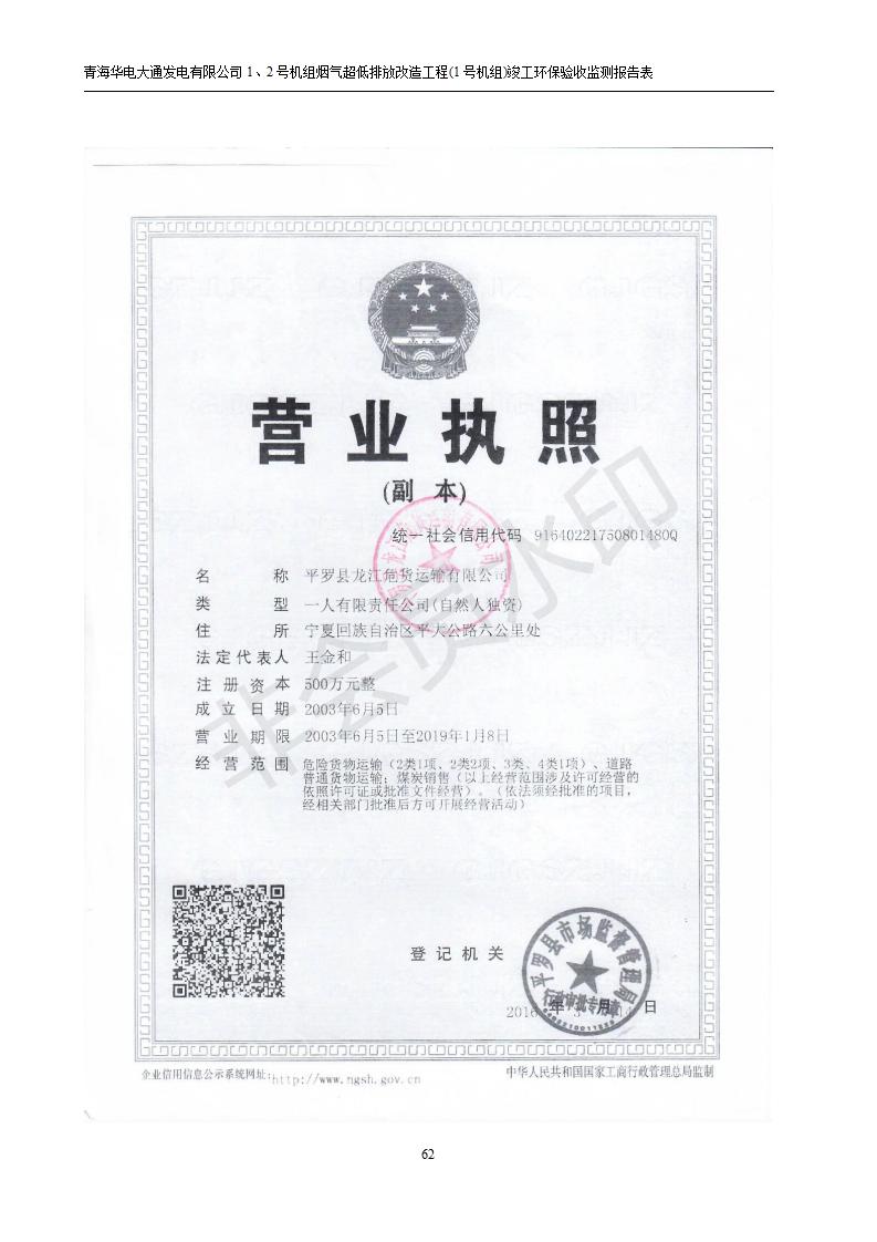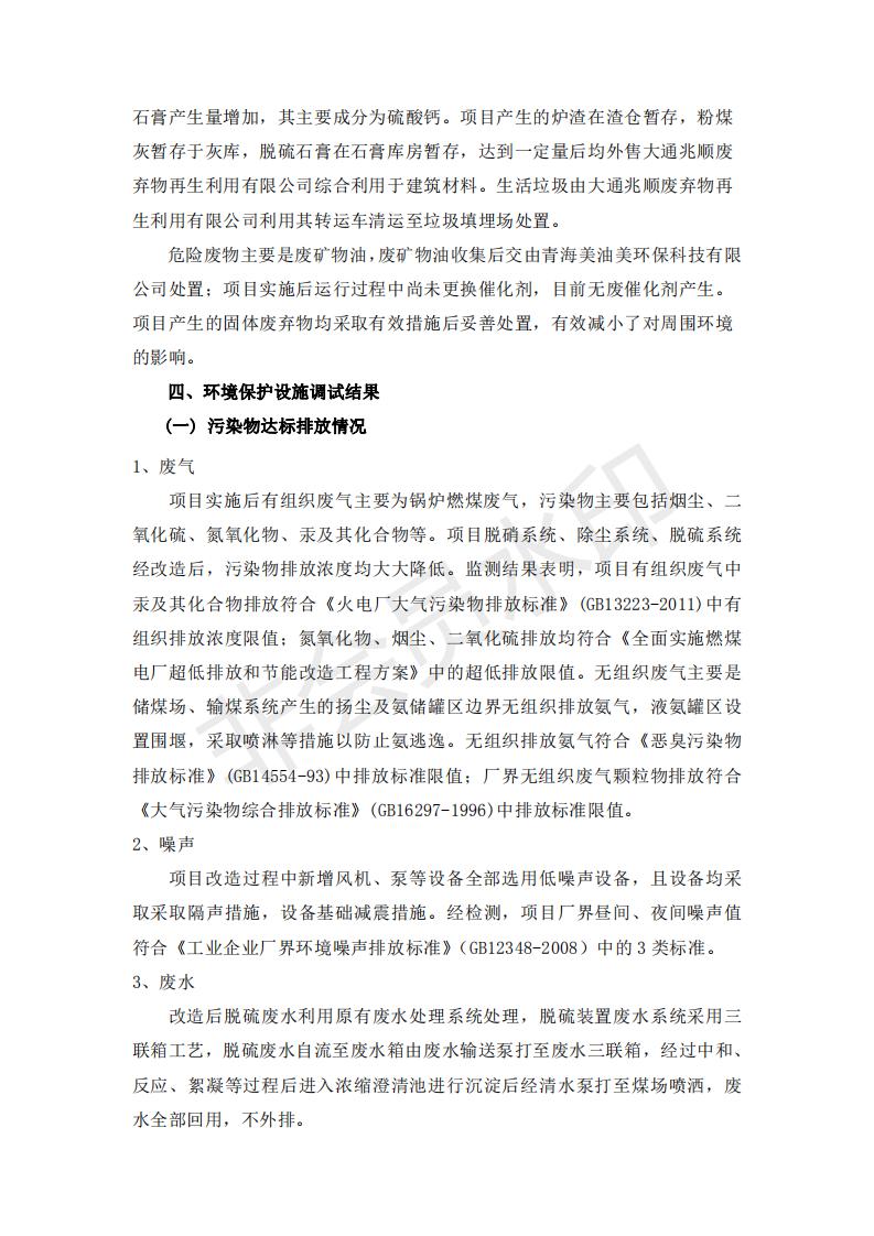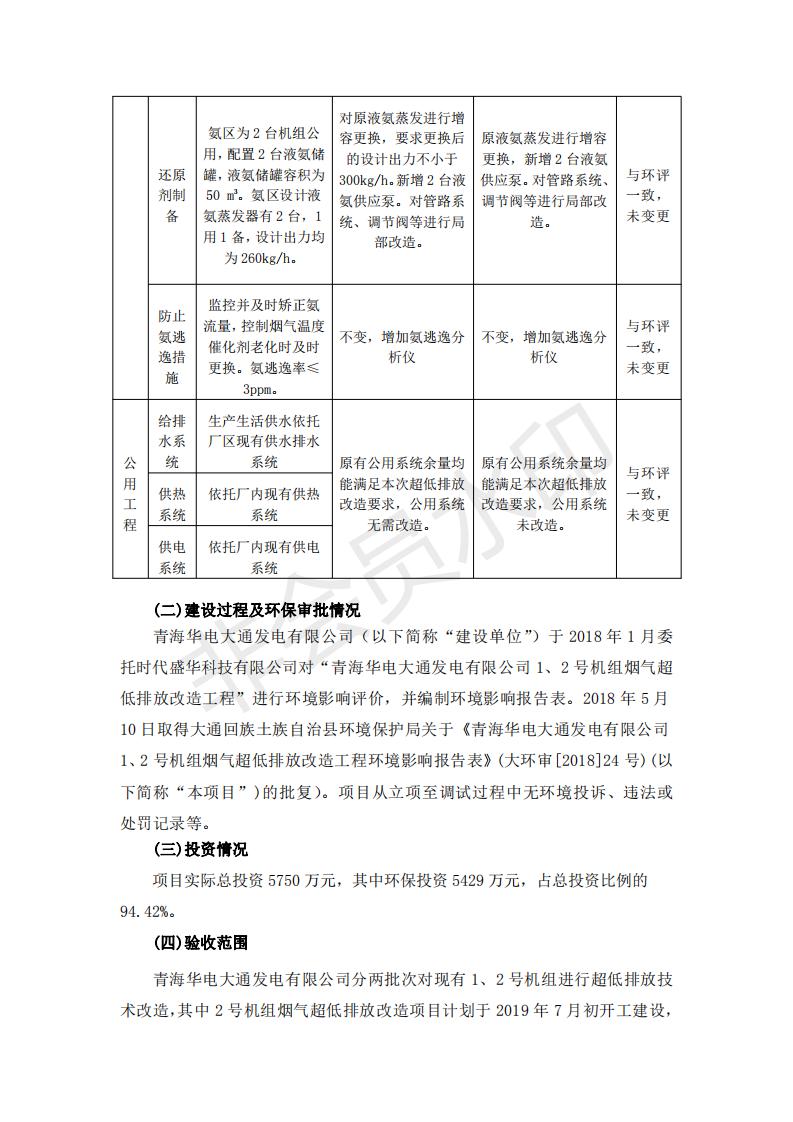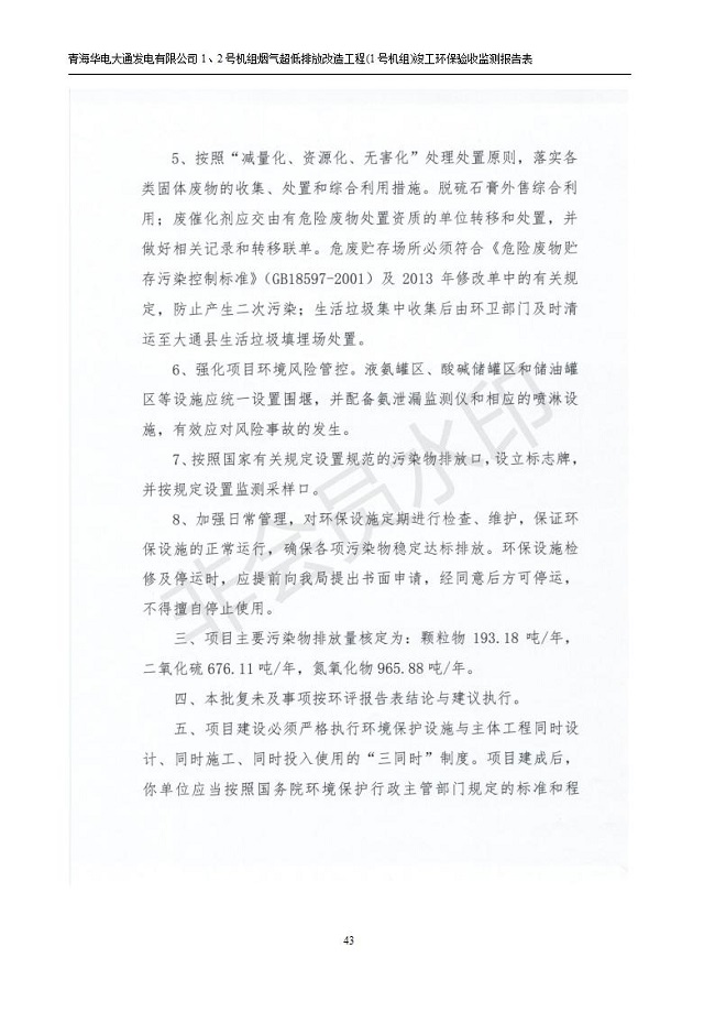 根據(jù)中華人民共和國國務院令第682號《國務院關于修改〈建設項目環(huán)境保護管理條例〉的決定》和《建設項目竣工環(huán)境保護驗收暫行辦法》(國務院令682號),青海華電大通發(fā)電有限公司1、2號機組煙氣超低排放改造工程(1號機組) (包括竣工環(huán)境保護驗收監(jiān)測報告表和驗收意見)公示如下。 一、項目名稱:青海華電大通發(fā)電有限公司1、2號機組煙氣超低排放改造工程(1號機組) 竣工環(huán)境保護驗收監(jiān)測報告表 二、地點:青海省西寧市大通縣寧張公路31公里處 三、建設單位:青海華電大通發(fā)電有限公司 四、建設內(nèi)容:1號機組煙氣超低排放改造,1號機組改造內(nèi)容為脫硫系統(tǒng)保留原脫硫裝置作為一級塔,新建二級合金托盤塔串聯(lián)吸收塔;對原“1+2”電袋復合除塵器的一電場電源進行改造,對布袋除塵器濾袋進行更換;對原脫硝系統(tǒng)選擇性催化還原法(SCR)脫硝工藝加裝備用催化劑,每層催化劑增加聲波吹灰器,優(yōu)化SCR反應器入口導流板。 五、聯(lián)系人:張工 六、聯(lián)系電 話:0971-6515411 七、公示時間:二〇一九年二月十三日至二〇一九年三月十二日 公示期間,對上述公示內(nèi)容如有異議,請以書面形式反饋,個人須署真實姓名,單位須加蓋公章。