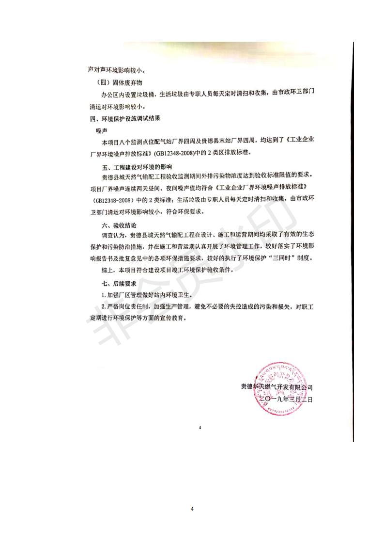 根據(jù)中華人民共和國(guó)務(wù)院令第682號(hào)《國(guó)務(wù)院關(guān)于修改〈建設(shè)項(xiàng)目環(huán)境保護(hù)管理?xiàng)l例〉的決定》和《建設(shè)項(xiàng)目竣工環(huán)境保護(hù)驗(yàn)收暫行辦法》(國(guó)務(wù)院令682號(hào)),貴德縣城輸配管線工程竣工環(huán)境保護(hù)驗(yàn)收內(nèi)容(包括竣工環(huán)境保護(hù)驗(yàn)收調(diào)查表和驗(yàn)收意見(jiàn))公示如下。 一、項(xiàng)目名稱:貴德縣城天然氣輸配工程 二、地點(diǎn):拉雞蓋澀寧蘭復(fù)線22#閥室-貴德縣城 三、建設(shè)單位:貴德華天燃?xì)忾_發(fā)有限公司 四、建設(shè)內(nèi)容:貴德縣末站、貴德縣配氣站、貴德縣中壓管網(wǎng)、拉雞蓋22#閥室-貴德縣城長(zhǎng)輸管線 五、公示時(shí)間:二〇一九年三月十一日至二〇一九年四月八日 六、聯(lián)系人:張工 公示期間,對(duì)上述公示內(nèi)容如有異議,請(qǐng)以書面形式反饋,個(gè)人須署真實(shí)姓名,單位須加蓋公章。
