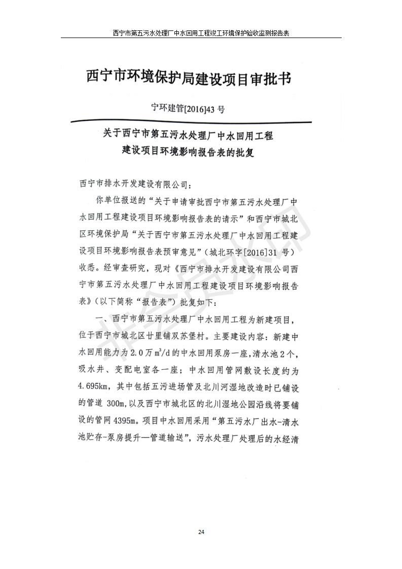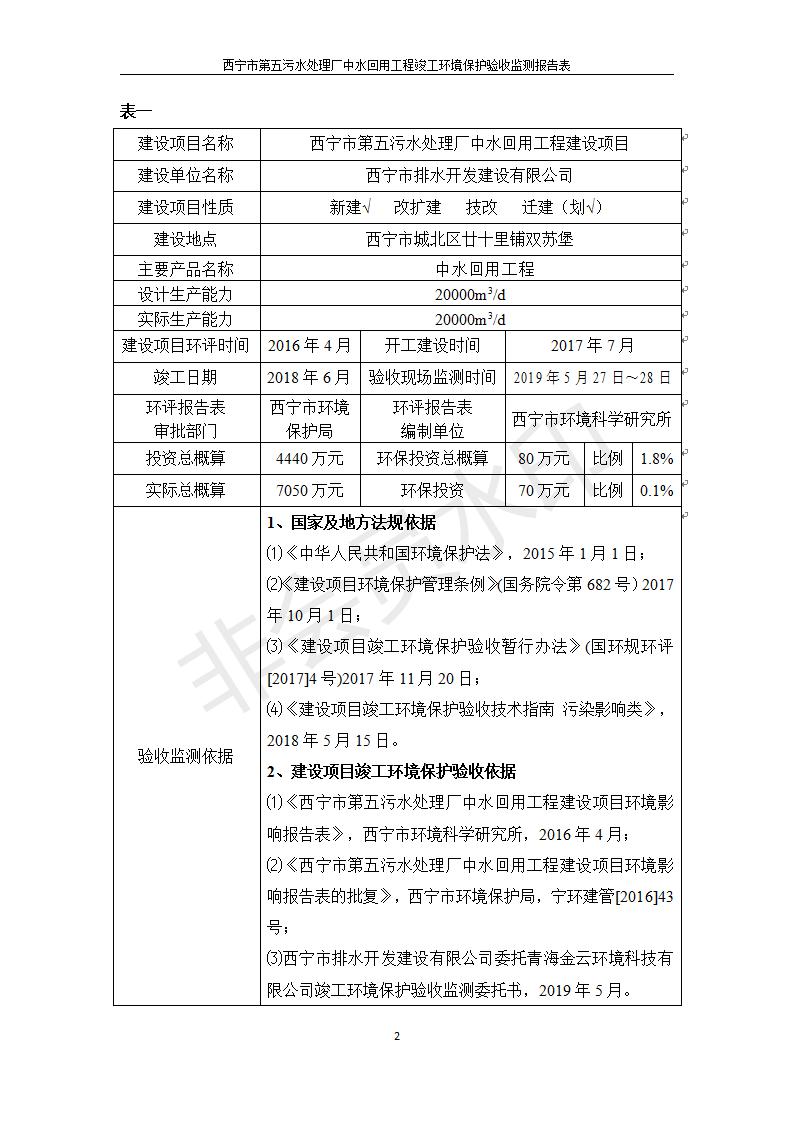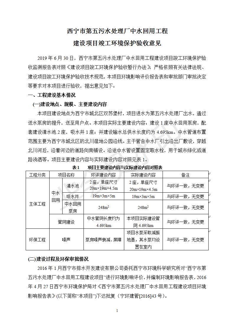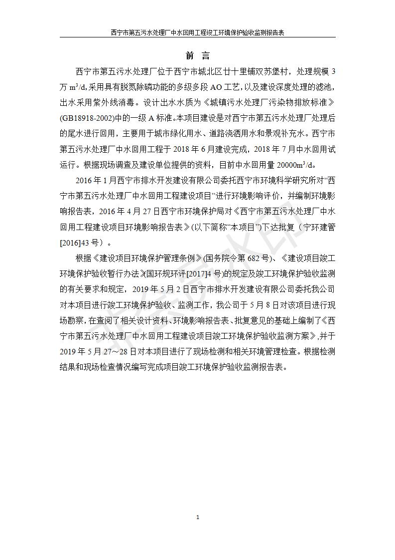 根據(jù)中華人民共和國(guó)國(guó)務(wù)院令第682號(hào)《國(guó)務(wù)院關(guān)于修改〈建設(shè)項(xiàng)目環(huán)境保護(hù)管理?xiàng)l例〉的決定》和《建設(shè)項(xiàng)目竣工環(huán)境保護(hù)驗(yàn)收暫行辦法》(國(guó)務(wù)院令682號(hào)),西寧市第五污水處理廠中水回用工程建設(shè)項(xiàng)目(包括竣工環(huán)境保護(hù)驗(yàn)收監(jiān)測(cè)報(bào)告表和驗(yàn)收意見(jiàn))公示如下。 一、項(xiàng)目名稱:西寧市第五污水處理廠中水回用工程建設(shè)項(xiàng)目 二、地點(diǎn):西寧市城北區(qū)廿十里鋪雙蘇堡 三、建設(shè)單位:西寧市排水開(kāi)發(fā)建設(shè)有限公司